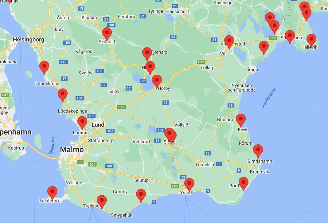 Karta, från camping.se, som visar samtliga campingar i Skåne. Använd Google, eller hemsidan för att interaktivt se namn och mer information om dem.